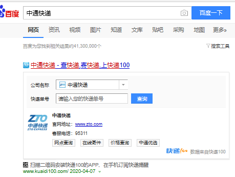 1、我们在百度搜索框中,直接输入中通快递,就会出现下图;