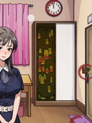 1.找到可疑的血迹、柜子上的钟、上锁的杂物间。打开窗帘找到墓碑,在衣柜里找到符纸。