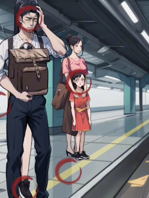 2.在车站中找到萎靡的男人、惊恐的孩子、男人身后翘起的脚、车站里稀疏的人流以及男人越过黄线的脚。
