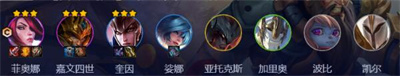 菲奥娜、嘉文四世、奎因、娑娜、亚托克斯、加里奥、波比、凯尔。