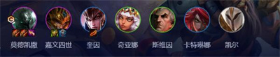 莫德凯撒、嘉文四世、奎因、奇亚娜、斯维因、卡特琳娜、凯尔。