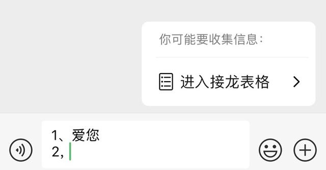这是目前只针对群聊的功能,经测试,在iOS v7.0.8版本(最新版)的微信中,微信群聊已上线接龙功能。但在Android v7.0.7版本中,并没有成功复现。