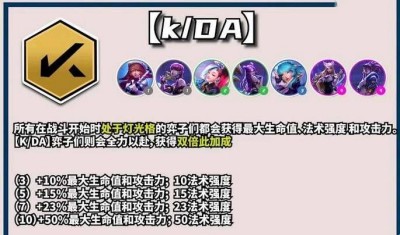 《云顶之弈》s10赛季中kda羁绊是一个非常厉害的羁绊,而且家族人数众多,还可以增加角色的法强,同一家族的英雄可以获得双倍加成哦,很多玩家都不知道这个羁绊的效果是什么,下面小编就给大家分享一下,我们一起来看看吧。