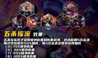 五杀摇滚是《云顶之弈》s10将会上新的一个新羁绊,他可以提高伤害加成以及伤害减免,击杀五个人还会有额外的效果,很多玩家都不知道这个羁绊的效果是什么,下面小编就给大家分享一下,我们一起来看看吧。