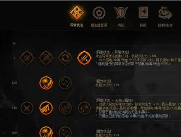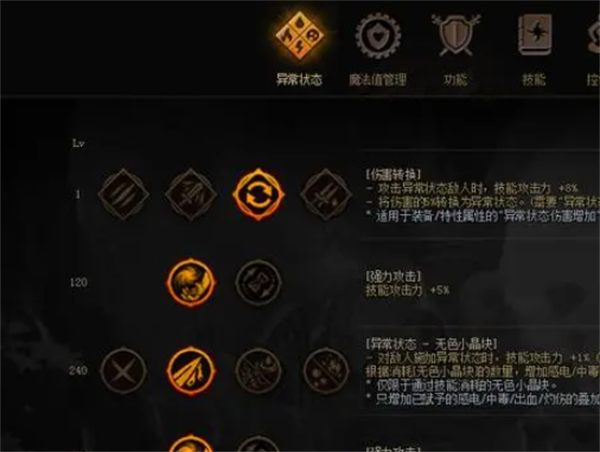 伤害转换、强力攻击、异常状态-无色小晶块、强力攻击、异常状态&伤害。