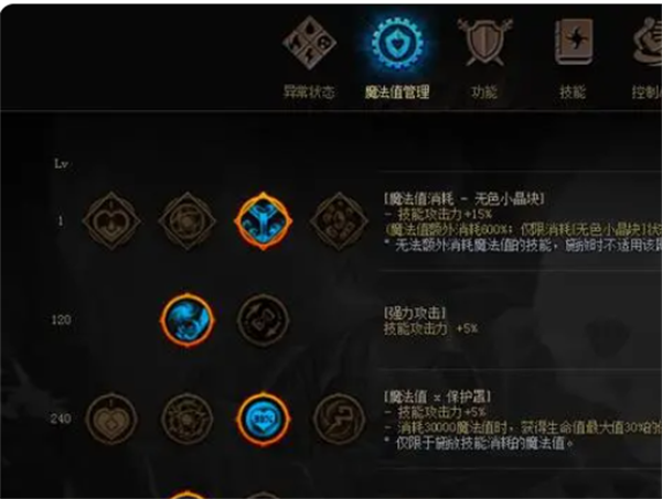 魔法值消耗&无色小晶块、强力攻击、魔法值&保护罩、强力攻击力、魔力饥渴。