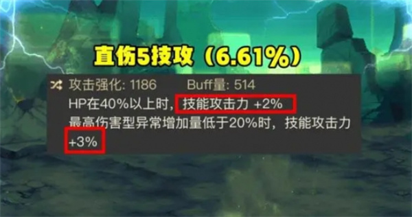 HP在40%以上时,技能攻击力+2%、最高伤害型异常增加量低于20%时,技能攻击力+3%。