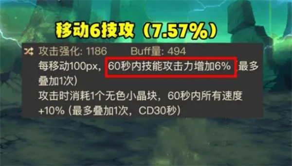 每移动100px,60秒内技能攻击力增加6%,攻击时消耗1个无色小晶块,60秒内所有速度+10%。