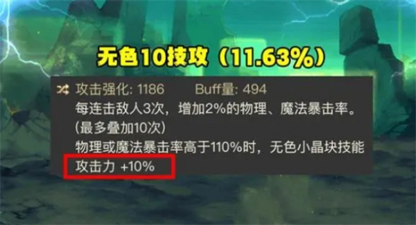 每连击敌人3次,增加2%的物理、魔法暴击率,最多叠加10次,物理或魔法暴击率高于110%时,无色小晶块技能攻击力+10%。