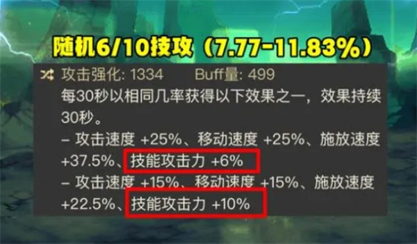每30秒以相同几率获得以下效果之一,效果持续30秒,攻击速度+25%、移动速度+25%、释放速度+37.5%、技能攻击力+6%;