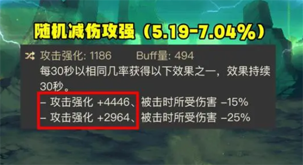 每30秒以相同几率获得以下效果之一,效果持续30秒,攻击强化+4446、被击时所受伤害-15%,攻击强化+2964、被击时所受伤害-25%。