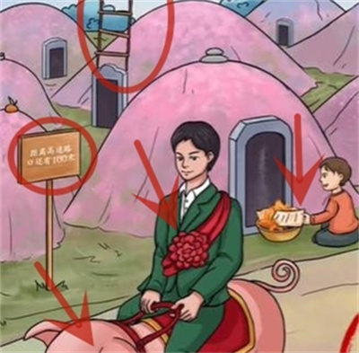 3.可以登天的电梯,高速路牌,小孩子烧的是作业,以及穿着绿西装骑猪的新郎。