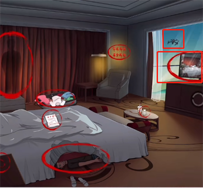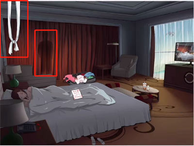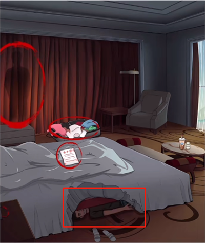 2.点击混乱的行李箱,床上的信和剪断的电话线以及床下的人。