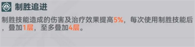 制胜技能造成的伤害和回复效果提升5%,每一次使用制胜技能后叠加1层,最高4层。