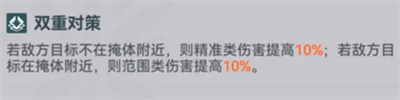 若敌方不在掩体周围,则精准类伤害提升10%;若敌方目标在掩体周围,范围伤害提升10%。