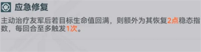 主动治疗友军后若目标生命值回满,则额外为其恢复2点稳态指数,每回合最多触发1次。