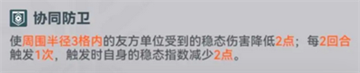 让附近半径3格内的友方单位受到的稳态伤害降低2点,每2回合触发1次,触发时自身的稳态指数减少2点。