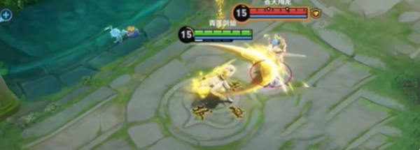 李白使用武器释放招式,脚下将会出现环形字样,头顶也会出现字样,金光周围还围绕着黑色字体。