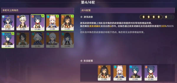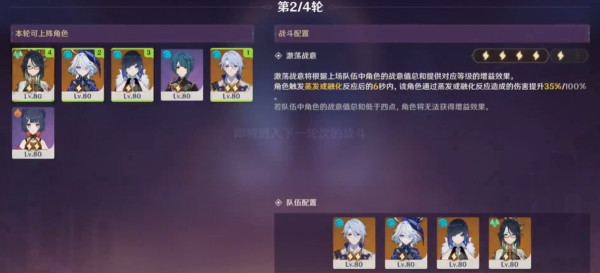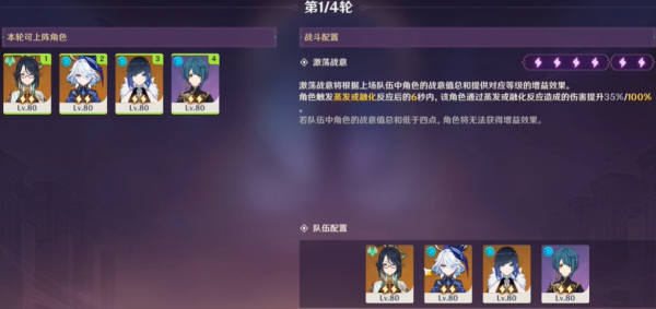 1、挑战机制是四轮战斗,第一轮选取4名角色组成队伍,后面每轮可以选2名角色加入。