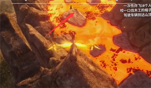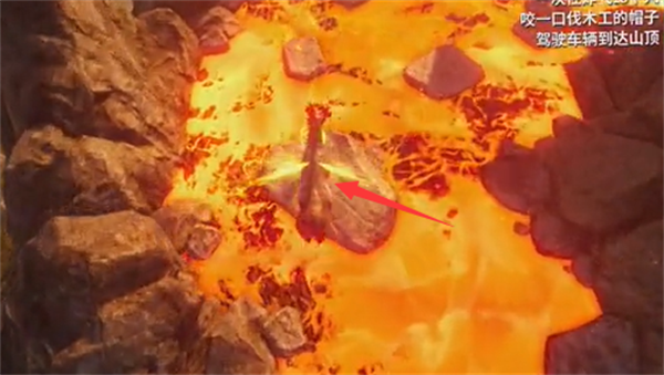 1、传送至火山附近,穿过木桥跳上石头;