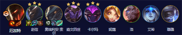 厄加特、赵信、奥瑞利安·索尔、嘉文四世、卡尔玛、妮蔻、洛、艾希、璐璐