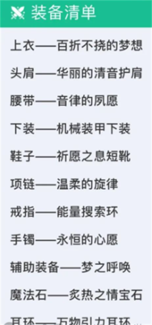 华丽的清音护肩、百折不挠的梦想上衣、机械战神裤子、音律的夙愿腰带、祈愿之息短靴。