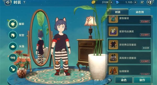 使用充足的魔法丝线和坚韧魔尘材料,在白银商会中制作服装。